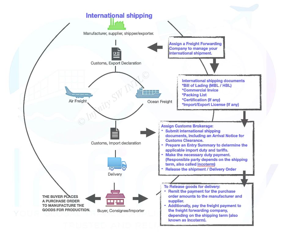 Here’s a flowchart illustrating the international shipping process, from the initial order placement by buyers to the manufacturer’s production of goods. Subsequently, cross-border international shipping commences with a trusted freight forwarder partner handling your shipments from origin to destination.